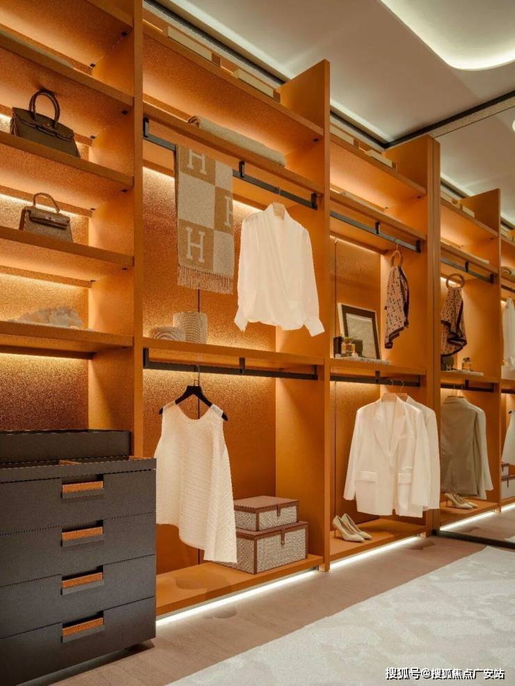 顺洄游动线绕行,是令人心动的B&B Italia Backstage衣帽间,层板与踢脚线的内嵌灯带会在开启时点亮,橙灰色调与牛皮结合,营造出如爱马仕展厅般的高级感。开放式设计让衣物一目了然,穿搭都成为一种仪式。
