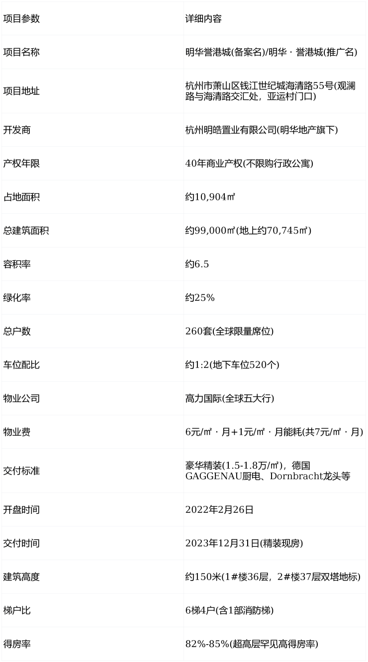 明华誉港城是杭州明皓置业有限公司在杭州钱江世纪城奥体核心打造的亚运村口一线江景地标,以270°环幕视野、3.95米极致层高和1.5-1.8万/㎡国际奢装标准,成为奥体板块不限购江景大平层的标杆作品,外号"亚运村江景明珠"。以下是完整项目信息:
