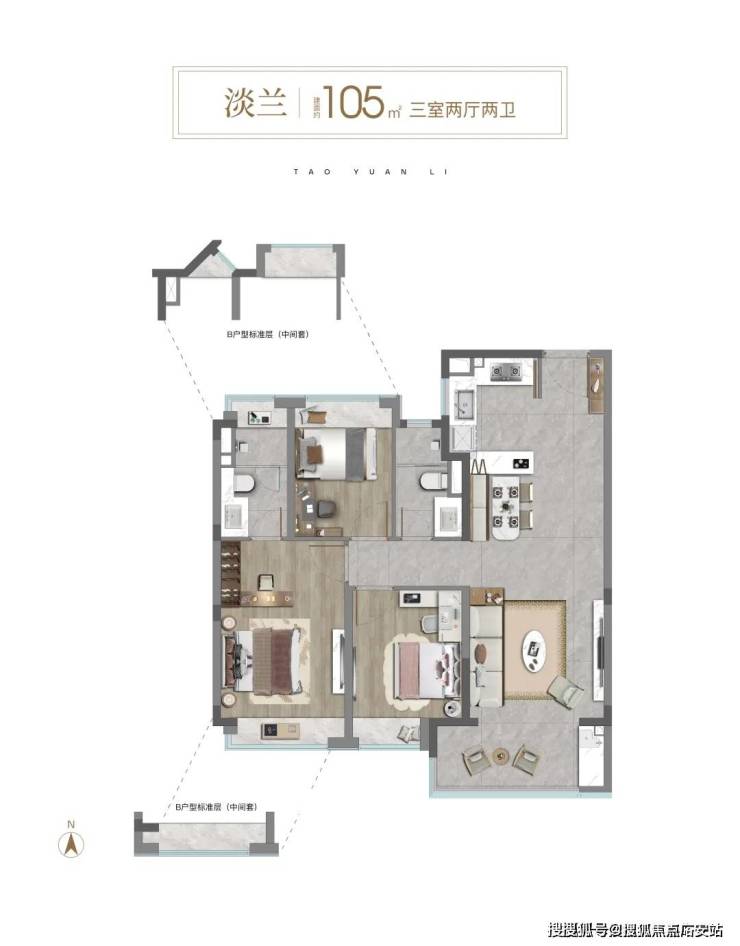 户型设计 充分考虑了现代家庭的需求:从83㎡两房到178㎡四房,全系列产品覆盖了不同阶段的置业需求。其中,106㎡三房两卫和126㎡三房两卫是主力户型,采用南北通透设计,户型方正,动线合理。