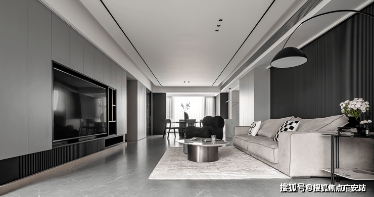客厅吊顶采用双层设计,为空间带来层次美感。沙发墙面实用灰色软包材料装饰,金属线条进行点缀,优雅不失高级感。