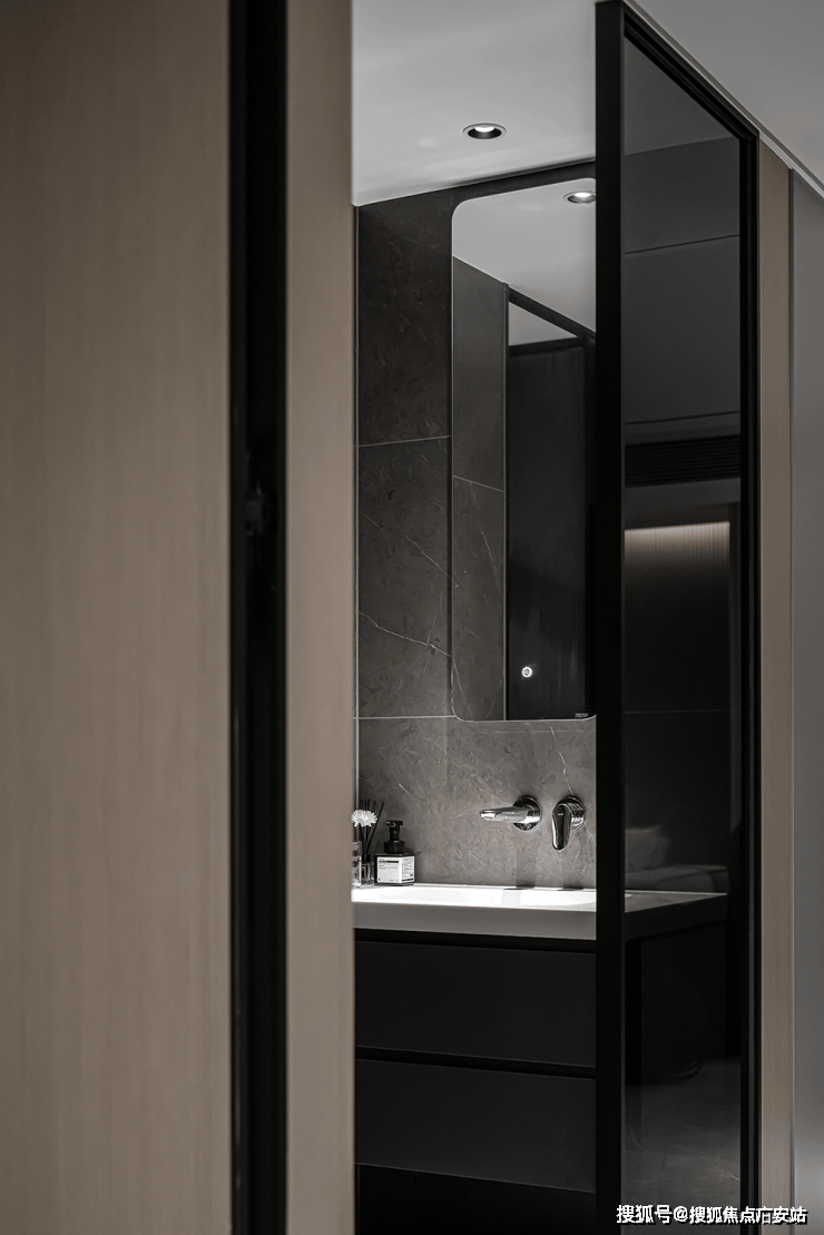 盥洗室采用独立空间,哑光黑的器具搭配大理石墙面,呈现出现代设计美感。