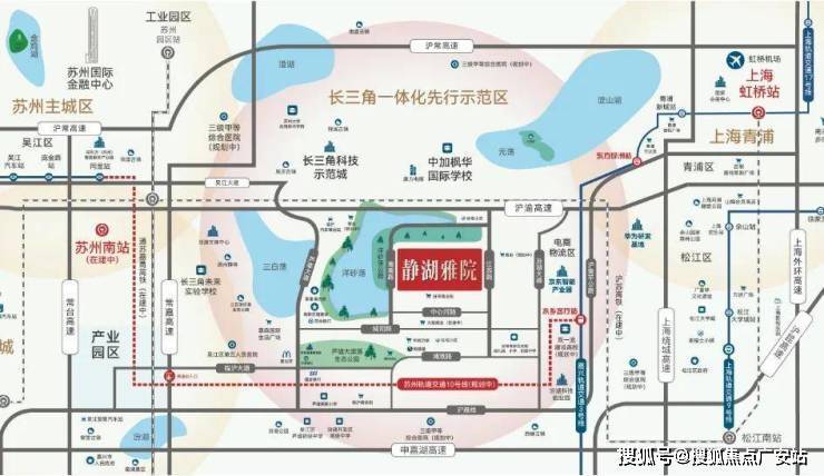 交通 苏州南站约7公里,沪苏湖铁路+通苏嘉甬城际高铁“十字”交汇,20分钟直达上海虹桥规划S7号线未来无缝对接苏州4号线与上海17号线,实现“半小时苏沪同城”公交线路727路、791路、795路、示范区4路等超10条线路,最近站点“汾湖实验小学站”仅300米