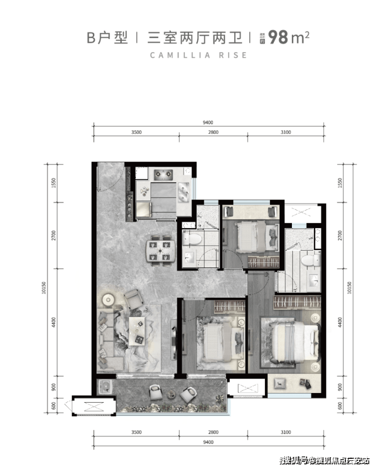 98㎡ 三室两厅两卫(约157万起)