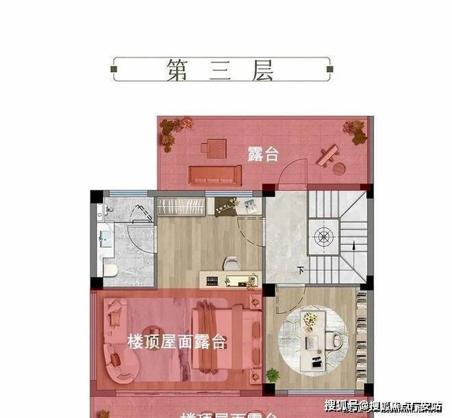 三层,整层套房设计。该层赠送约23㎡的南北双向大露台,这里作为建筑的“空中延伸空间”,兼具视野开阔、采光充足的优势,无论是打造成亲近自然的露台卧室,还是多功能的生活场域,都能极大提升居住体验。