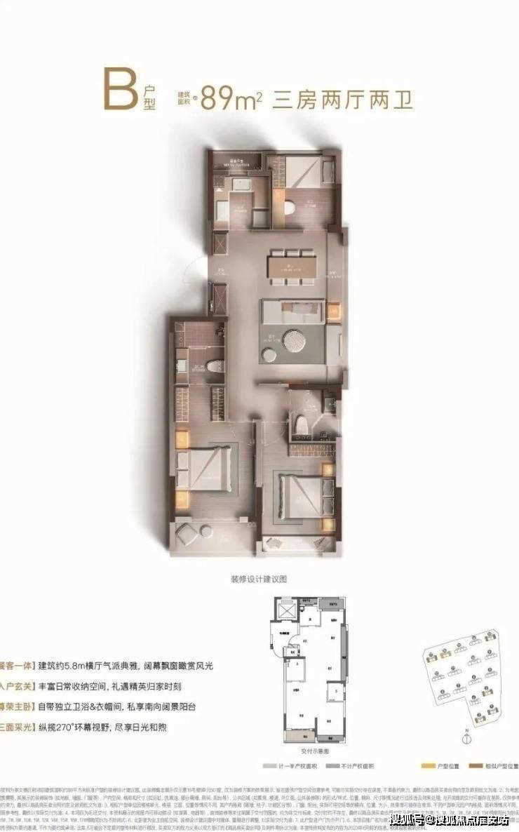 主力产品为建筑面积约89㎡户型,三房两厅两卫格局,南向三开间带宽幕双阳台,轻松容纳三口之家的温情与欢乐;建筑面积约110㎡均为边套户型,纵享丰富观景视野,四房两厅两卫设计并蓄尺度感与尊崇感。