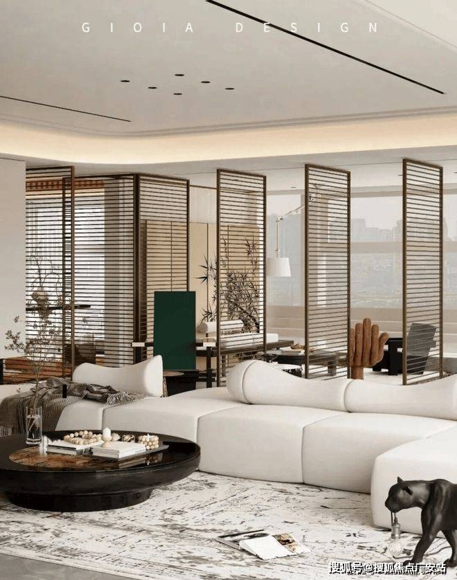 将艺术感进一步融入日常中。特别设计的专属门厅空间,是从电梯厅延伸到家,如同一处艺廊,放慢人的情绪;室内选用了浅金色奢石(外界也称其为“芬迪白大理石”)作为主要的石材,曲面的木饰面也为浅色,整体给人以明亮感。
