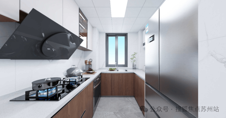 厨房为U型布局,配置 定制橱柜、老板烟灶、林内热水器,台面为人造石,水槽为邦克台下盆,细节处体现人性化考量。