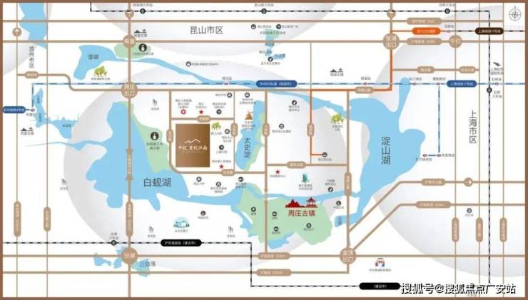 目紧邻常嘉高速周庄出入口,亦可迅速接驳同周公路;规划中的轻轨S3号线则东连上海17号线漕盈路站,西接苏州4号线同里站;
