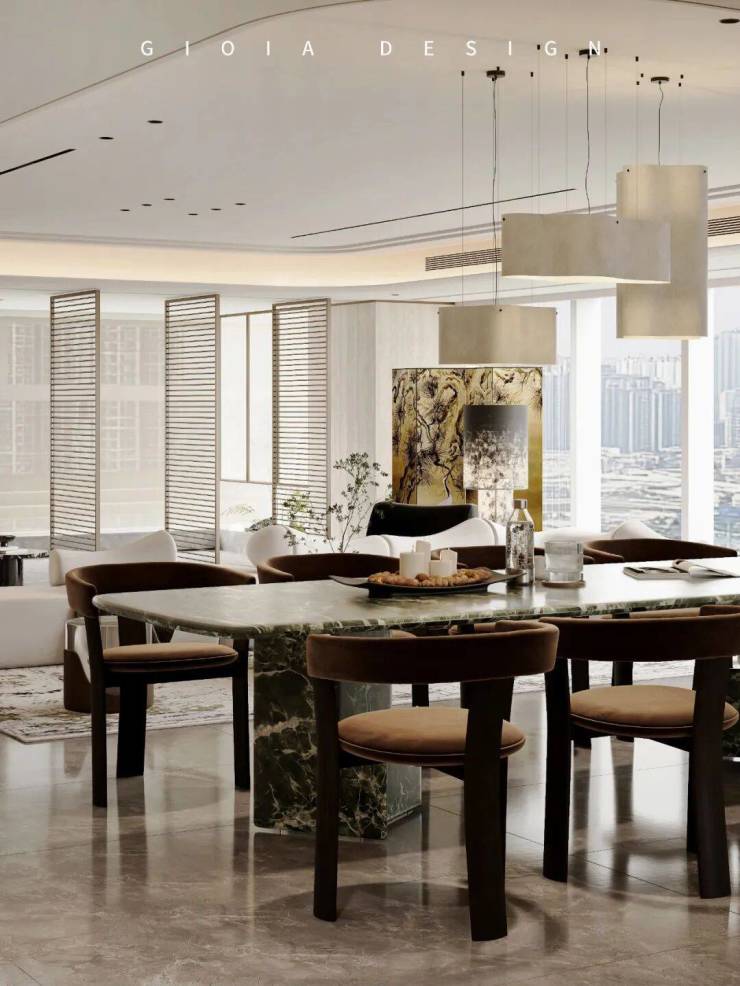 移步餐厅,VisionnairePrevious餐桌以卡里冰玉大理石点亮空间。冰白色石材中若隐若现的浅灰纹路,如江南烟雨晕染的诗意,与翡丽风格芬迪白大理石墙面形成材质延伸。餐桌边缘金属收边线条精致如首饰,灯光下折射柔和光泽。搭配的HessentiaLisbona餐椅,弧形靠背贴合人体曲线,纤细金属椅腿轻盈支撑,让用餐成为舒适与美学的双重享受。