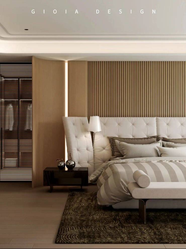 主卧中,VisionnaireRipley床架以低调奢华诠释休憩美学。深灰色真皮面料带着荔枝纹肌理,床头绗缝工艺暗藏对称美学,金属嵌条如精致腰带勾勒轮廓,与硬装艺术玻璃形成呼应。两侧悬浮床头柜轻盈悬空,玻璃台面与金属支架透着现代气息,柔和灯光洒在床品上,营造静谧安稳的睡眠氛围。