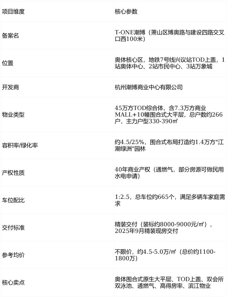 核心结论速览:这是杭州奥体核心区唯一围合式原生大平层TOD综合体,由滨江物业直管,连续3年蝉联杭州大平层销冠,主打建面约330-390㎡高定私域(总价约1100-1800万),具备TOD上盖+围合式度假园林+双会所双泳池+3.3米层高+83%-86%高得房率+通燃气六大核心亮点;短板是40年商业产权(影响贷款与税费)、商水商电、部分楼栋临主干道有噪音、商业MALL招商中、总价门槛较高。适合预算1100万+追求奥体核心TOD便捷生活、看重围合式园林与高得房率、需要通燃气满足家庭居住需求的高净值家庭。