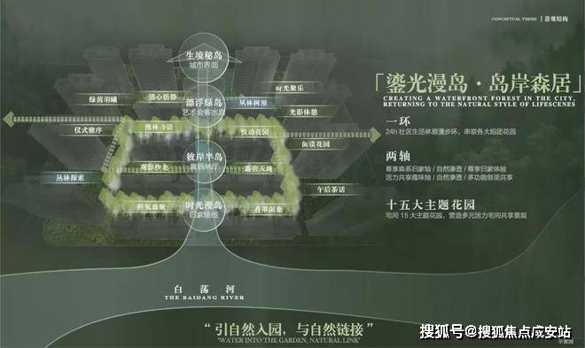 凭借天然河岸、1.8容积率,项目融“山水聚场”理念,规划 “一环二轴十五园”景观布局,以水岸、岛屿、森林、花园、树屋为笔触,演绎“行在景中、坐在岛中、游在林中”的诗画意境。