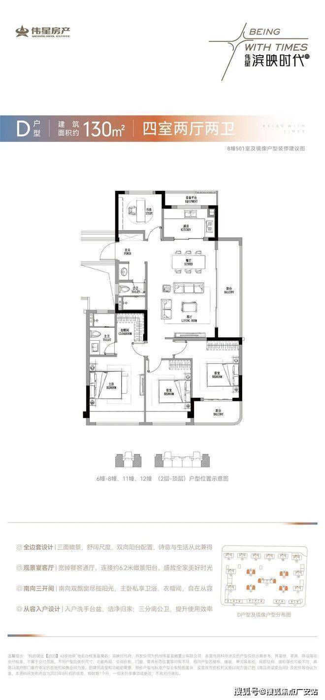建面约130方轩敞四居一步到位改善四房,格局优秀,三开间朝南,双阳台配置+大采光面,兼顾晾晒与社交休闲功能的同时,采光、视野与通透性,也能得到很好的保证。