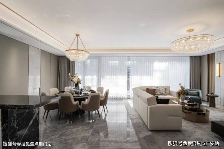 摆上一组沙发,或静坐闲读,或花园晚餐,或邀三五好友欢聚,都有一种悠然自得的安定感。长面宽、短进深格局来到室内,一楼层高约3.4米、面宽约7米大横厅霸气十足,搭配大面落地窗,阳光清风肆意涌入,将室内映衬的一片明亮,毫无阴影死角。