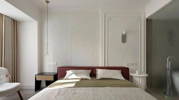 奶白色基调,释放出让人慵懒放松的睡眠氛围。床头法式线条和格栅作为点缀,稳重大方却又不失精致优雅。