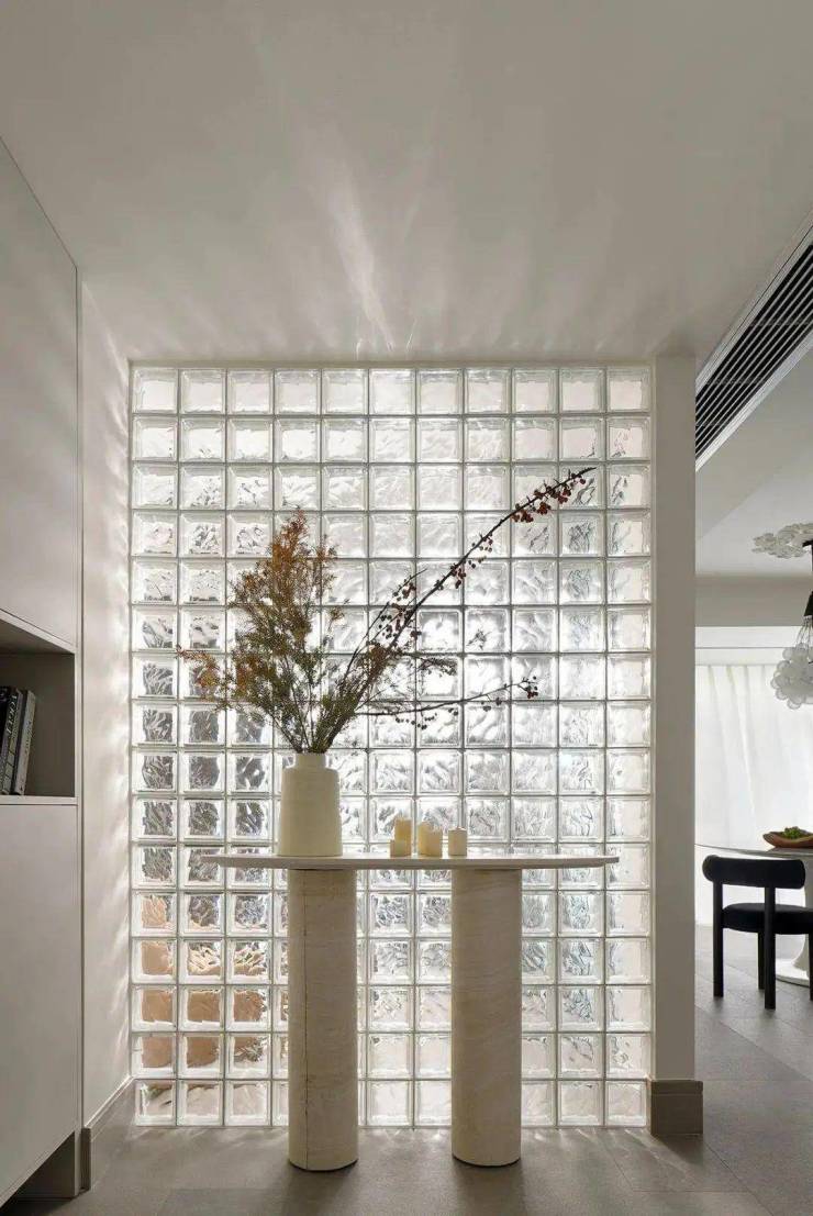 与多功能房直接的墙体改为整面空心玻璃砖,隔而不断,透光不透影,赋予回家满满的仪式感。