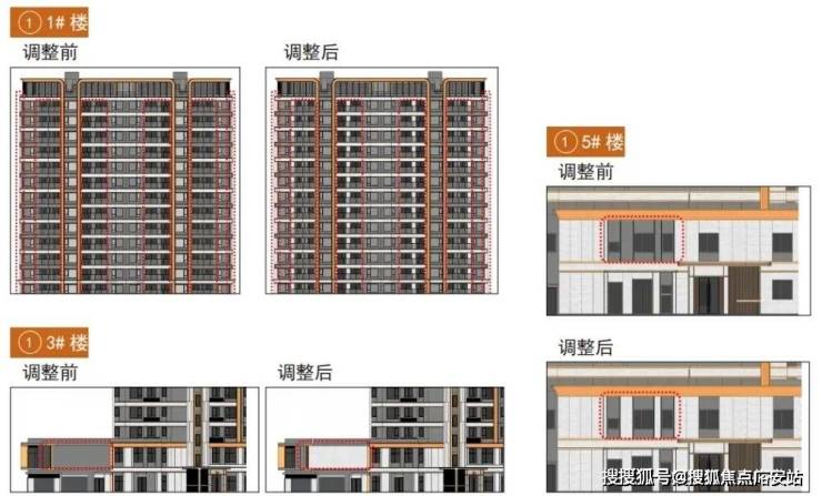 配套建筑同步升级:6#楼的 南立面调整了铝线条间的涂料颜色 ;8#配电站将台阶玻璃栏杆换为更耐久的 不锈钢栏杆 ,台阶及台阶下方浅色铝板改为 浅色仿石涂料 ,并调整外门开启角度至 180度 ,兼顾美观与实用;9#门卫兼快递收发室优化了屋面、柱子材质颜色,并根据现场深化了落地窗尺寸。