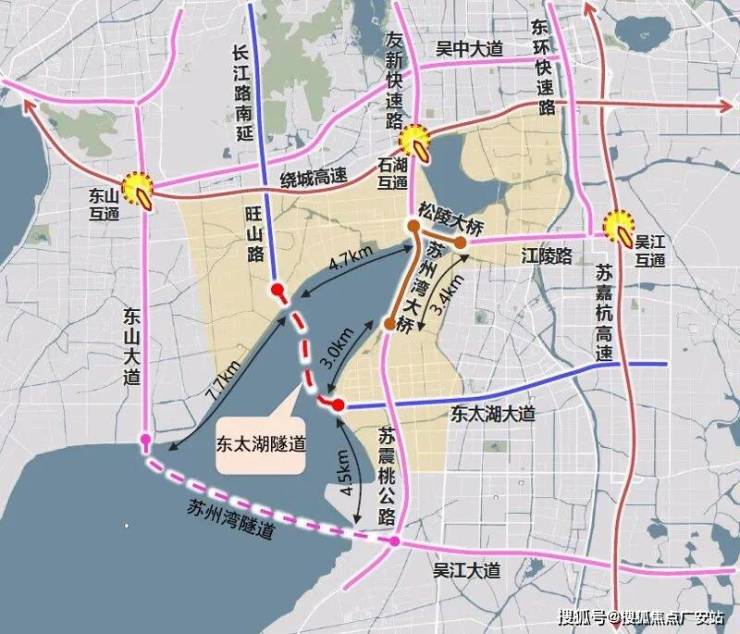 向东通过吴江大道衔接长三角一体化示范区和苏州南站综合交通枢纽,向南连接湖州。苏州湾隧道推动“环太湖世界级湖区”“环太湖科创圈”“吴淞江科创带”建设具有重要意义。
