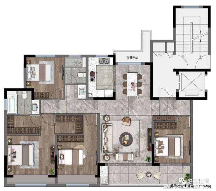 建面约125㎡三房两厅两卫户型是天健和景的主力户型,它以四开间朝南、约13.1m阔绰尺度、约6.6m双联宽景阳台和全明飘窗,纵览揽园林胜境,约7.3m进深主卧套房,步入式衣帽间,将女主人的优雅尽显,还原人居原本的舒适生活。