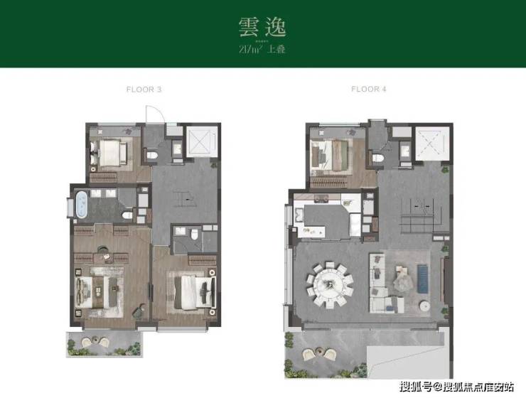 3楼卧室空间,格局与下叠一致,2个套房+1个类套房3卧设计。
