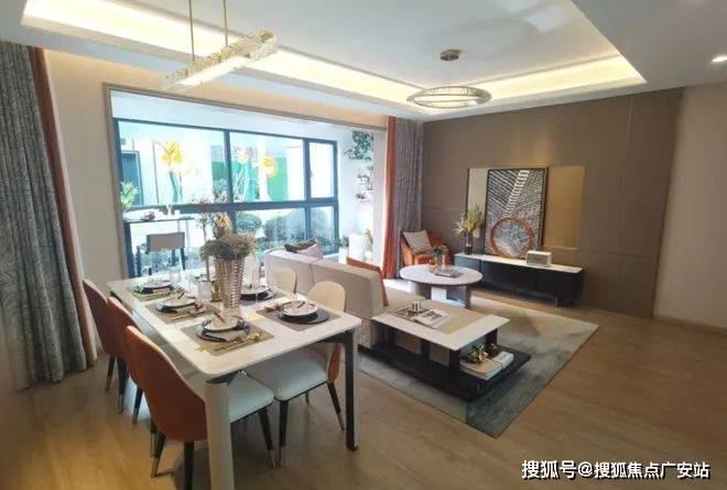 客餐厅一体,餐厅可容纳6-8人桌,阳台开间约5.4米,交付时阳台采用钢化玻璃和铝合金材质,为业主节省了精力和成本,也保证了小区外延整体的整洁美观。