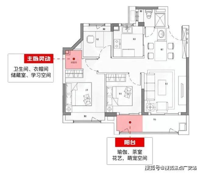 89㎡3房2厅2卫户型,一般只能做1卫,但项目在主卧设计了一个“+1灵动空间”,你可以像样板房把它打造成卫生间,项目预留了排水管。也可以做成衣帽间、梳妆台、储藏间,或者学习空间。