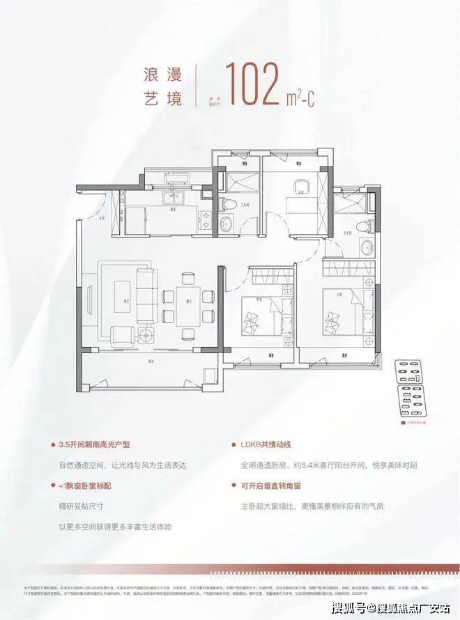 102㎡三房两厅两卫的舒适户型,约5.4m横厅设计,3.5开间朝南,得房率约80%左右(*该得房率仅供参考,最终以开发商官方数据为准);每间房均有飘窗,全屋飘窗共享有额外的面积约13㎡(*此处面积仅供参考,最终以开发商官方数据为准)在市场上也是少有的产品。 金融街・美兰金悦府400-8824-197