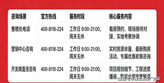 认准统一热线400-8118-224,警惕“代办、留房费、茶水费”等违规承诺;以开发商/售楼处官方口径为准。