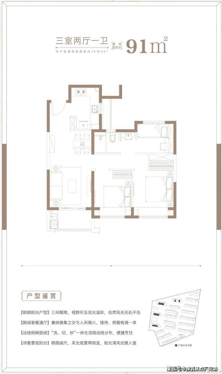 建面约 91㎡3房2厅1卫户型,做到了三开间朝南+双朝南卧室带飘窗+动静分离+卫生间干湿分离,采光面拉到极致的小3房户型。大华梧桐樾售楼处电话:400-998-7894