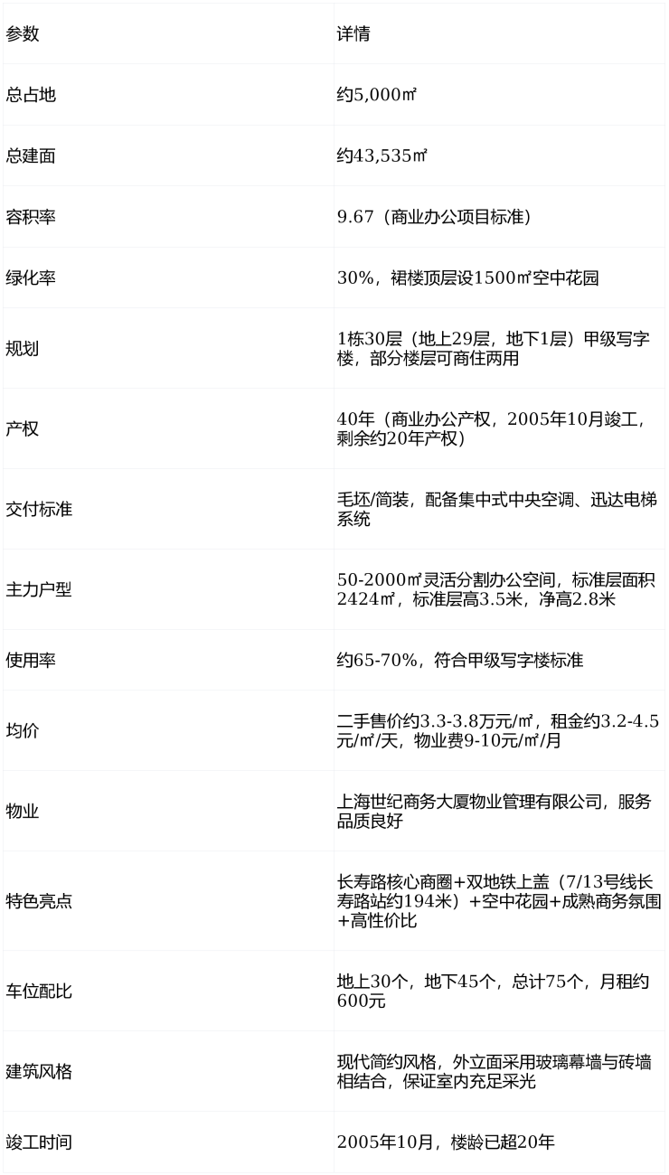 世纪商务大厦是上海普陀区长寿路核心商圈极具性价比的甲级写字楼/商住两用项目,依托“长寿路核心+双地铁交汇+成熟商务配套+高性价比租金+灵活分割空间+空中花园”六大核心优势,特别适合在上海主城(静安、普陀、长宁)工作的中小企业、初创企业,以及追求稳定租金收益的投资者。
