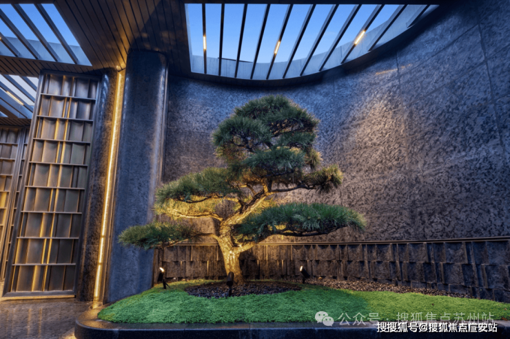 为了给业主一个完美的归家仪式感,项目设计了长约35m宽,约5.1m高奢阔门头,且有名贵黑松迎客。