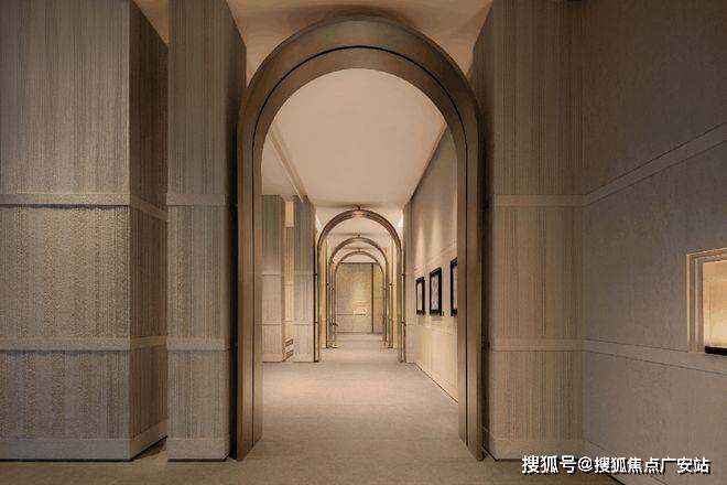 项目大门内外两重门厅景墙运用月光米黄石材近1000 方,搭配香槟金金属线条,汲取爱马仕全球旗舰店的双曲面叠墙造景手法,增加景墙奢华质感。