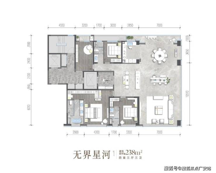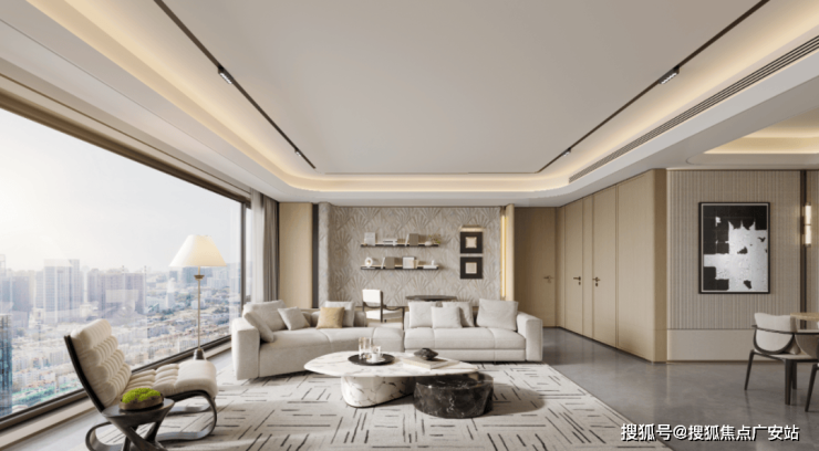 最炸裂的当属约238㎡户型,据悉一个客厅就有约100㎡,三面环幕设置,观景采光效果拉满,非常硬核。