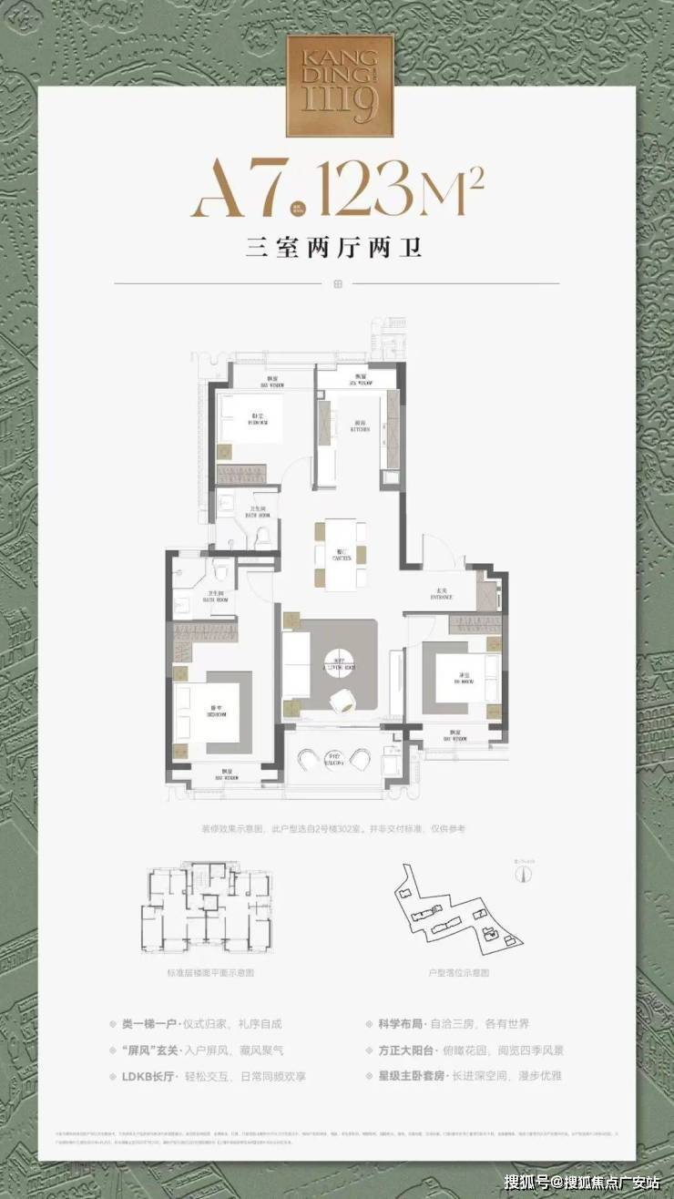 建筑面积约123㎡三房户型,飞机式布局,一镜到底的LDKB长厅,尽显隐贵静安风范;