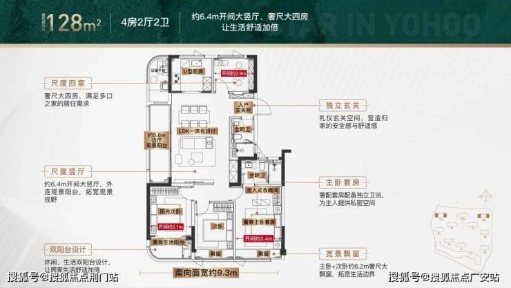 约6.4米开间大竖厅,约9.3 米南向观景面,