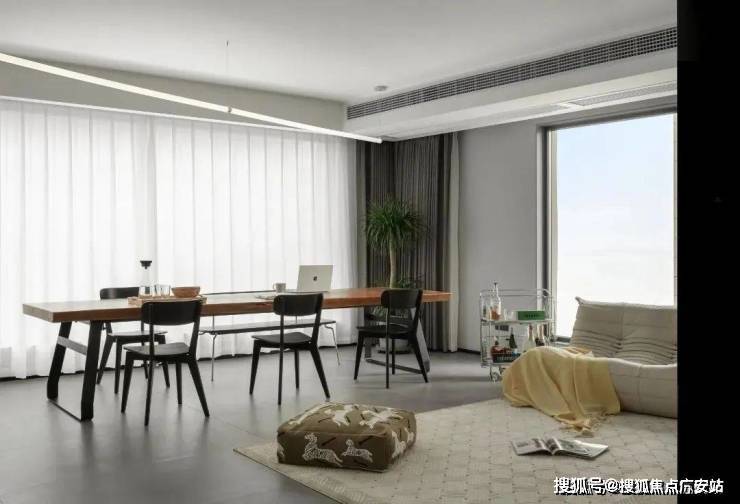 客餐厅采用一体化的设计,空间更加区域敞亮,恰到好处的留白带来了更多的高级感,用懒人沙发和长桌来划分空间,这种划分空间的方法不隔断空间,更加有层次,点线面结合更富东方的美学意境,让人与空间之间相互深度交流.
