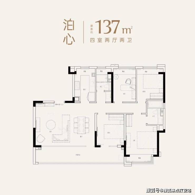 137㎡【泊心】:4室2厅2卫,南向四开间朝南,IMAX级轩阔横厅,跑道式双联大阳台,主卧套房设计,满足三代同堂需求