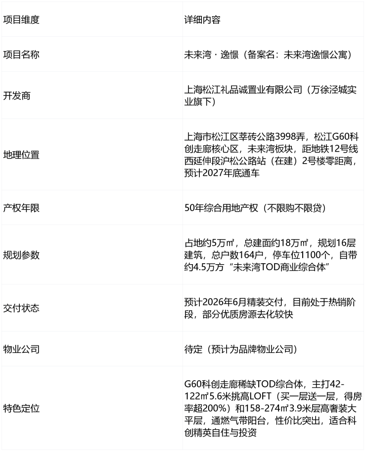 未来湾逸憬作为G60科创走廊核心+12号线地铁口零距离+5.6米挑高LOFT+不限购现房+3万/㎡均价+20万方TOD商业+佘山生态+46-274㎡全能户型的稀缺组合,精准击中刚需、改善与投资客群"科创产业红利+双轨通勤+空间超值+零限购+低门槛+全维配套"的核心诉求,核心优势归纳为七大维度,完美融合科创产业引擎+双轨交TOD+空间赠送之王+不限购现房+价格倒挂红利+全维配套+生态宜居,是上海西南140-450万级市场的"洞泾科创TOD标杆"。