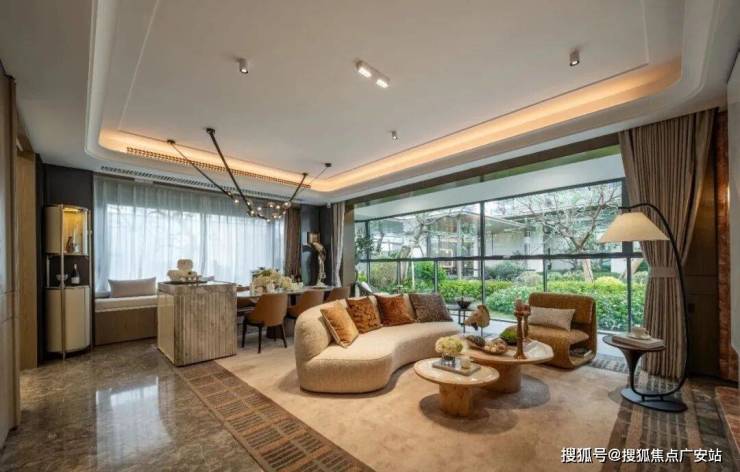首层的餐客厅+9.8米跑道阳台的尺度感极强,形成超尺度“洄游聚厅”,客餐厅东侧超大全明飘窗,呈现约270°景观视野,将景观视野与室内尺度感提升至全新高度。