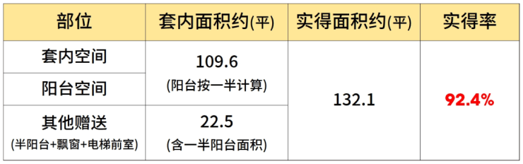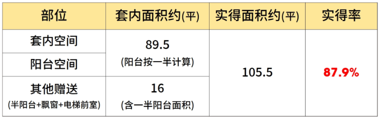 该户型大量的飘窗+双阳台设计,保证了每个功能间的通风采光,也提升了户型的实得率。经过专业建筑师测算,假设阳台全部封闭的情况下,项目建面约120㎡户型实得面积约105.5㎡,实得率约88%。(该实得率数据根据实得面积预估计算所得,仅供参考,不作为置业依据。最终得房率以购房合同为准)