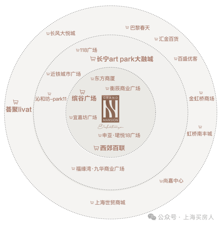 商业方面:北新泾站上盖规划约5万㎡商业综合体,与周边百联西郊、缤谷广场形成“15分钟消费圈”,辐射临空经济园区高净值人群。步行700米至百联西郊购物中心(重装开业),1站地铁至威宁路站缤谷广场,2站至中山公园龙之梦。3公里内覆盖古北黄金城道、ARTPARK大融城等高端消费圈。