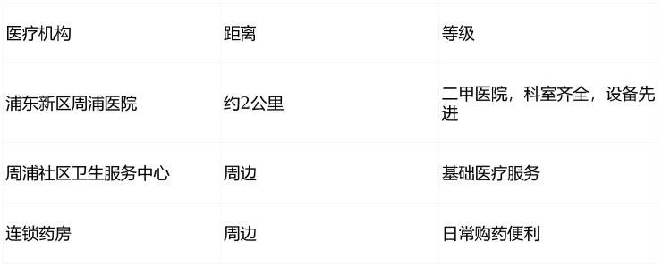 🏥完善医疗保障:距浦东新区周浦医院(二甲)约2公里,周边还有社区卫生服务中心和多家连锁药房。