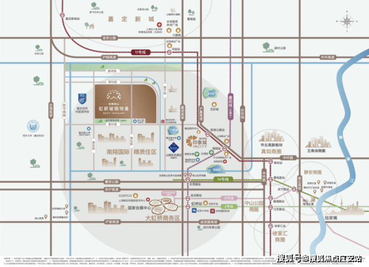 整个南翔板块区位优势明显:距虹桥核心区直线距离约13KM,享受大虹桥强势能级辐射。同时承接虹桥国际开放枢纽北向拓展带重要节点,一脉虹桥发展金线,南翔进阶大虹桥主城生活区,成为中央商务配套区和高品质国际化社区目的地。