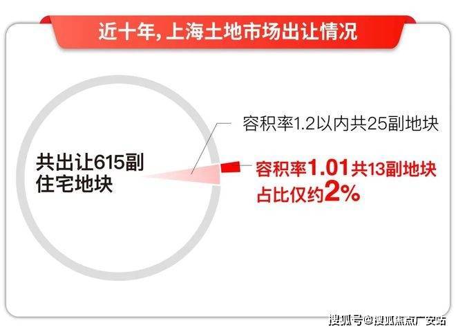 近十年,上海共出让615副地块,容积率1.2以内,共25副地块,占比仅约4%。这其中,容积率1.01,共13副地块,占比仅约2%。