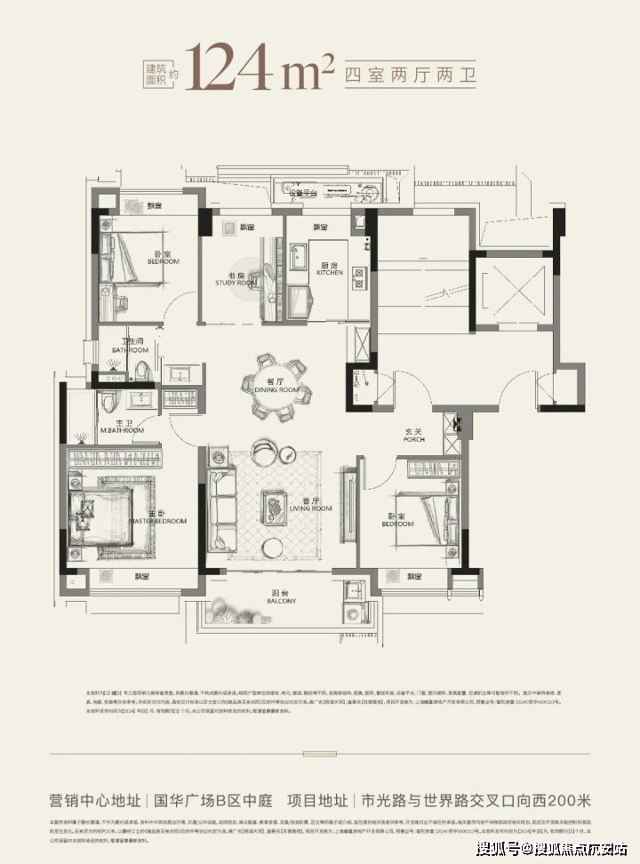 建筑面积约124㎡四房南北通透,是五层低密洋房产品,改善一步到位,很适合三代同堂家庭居住。