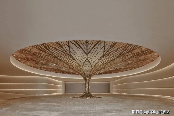 大堂「生机之亭」高约15米,凌空矗立为归家动线的核心枢纽。藤蔓枝干与天花交织缠绕,地面与顶面纹理呼应,共织以森林韵律为魂的生态栖居归家仪式。