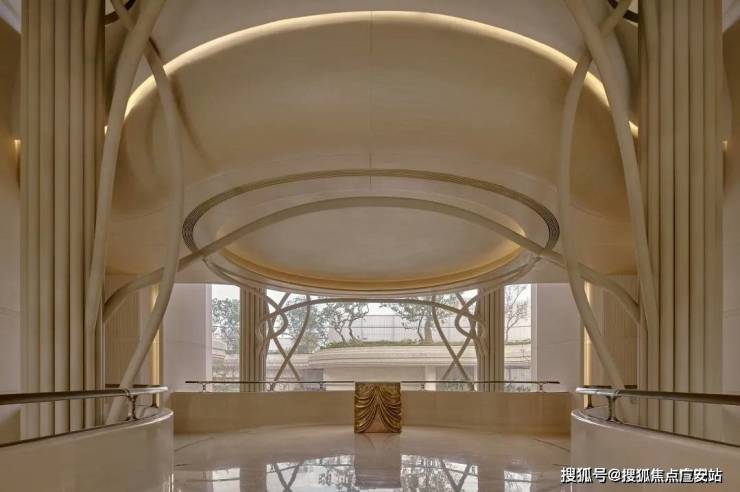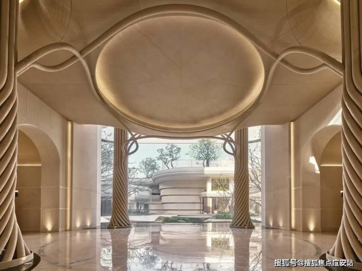 大门内外两重门厅景墙运用月光米黄石材近1000方,搭配香槟金金属线条,汲取爱马仕全球旗舰店的双曲面叠墙造景手法,增加景墙奢华质感。项目沿河的楼幢整体上抬,也就是——抬地式。好处在于地库通风,客户行车归家动线更合理。