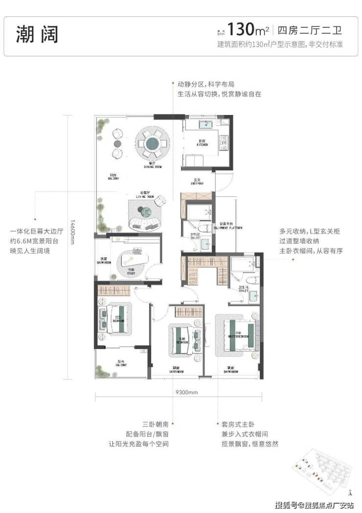 再来看项目的四房户型,有建面约127方、约130方2款。控总价的建面约127方:这款户型的每一点巧思,统统都是豪宅标准:LDKB的户型设计;封包阳台+3卧室均带飘窗;南向超大开间;