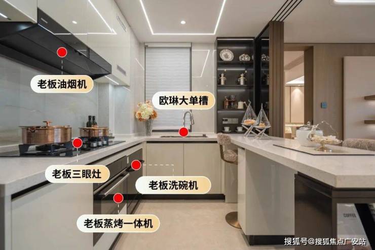 厨房配置老板油烟机+三眼灶+蒸烤一体机+洗碗机四件套,搭配欧琳大单槽,卫浴为科勒等一线品牌,细节拉满