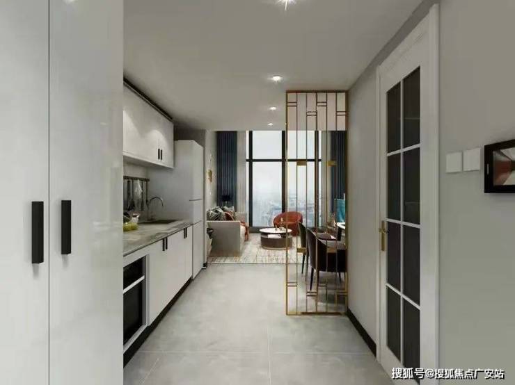 The open kitchen layout is spacious and transparent, allowing the dining room, kitchen and guest to enjoy a good view. All the appliances are hidden in the white cabinets, creating a lively and grand atmosphere.